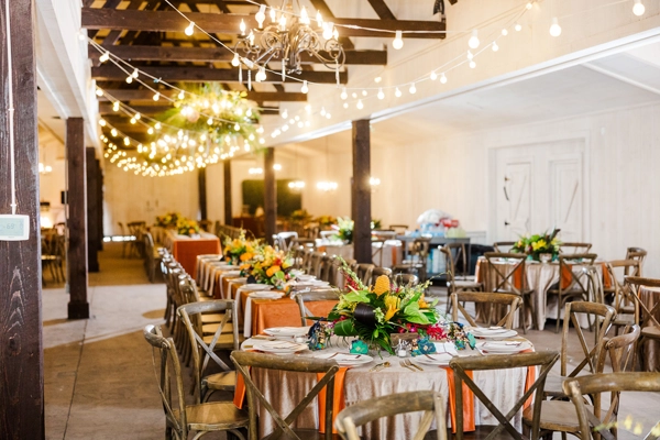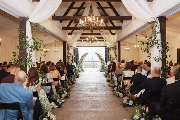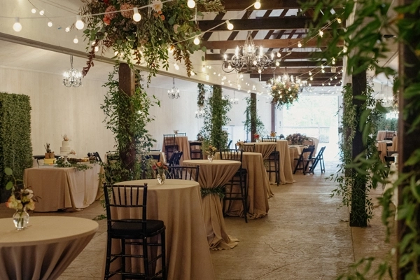 The walkway leading to the Carriage House Gardens is a brick walkway with bistro lights that line the pathway, it is a perfect picture spot, and your guests will love walking though this! Once they enter the Carriage House Gardens, you are surrounded by beautiful trees and nature in this quiet and peaceful ceremony spot that is tucked away! After the ceremony, your guests can head up to the Carriage House porch which is a perfect cocktail hour location that overlooks your ceremony! When it is time, we will open the large sliding doors that lead into the Carriage House where your guests will be wowed by the reception set up and details! The Carriage House offers beautiful and elegant chandeliers that hang along the sides and down the center! This reception location is climate controlled and therefore perfect for winter months!
